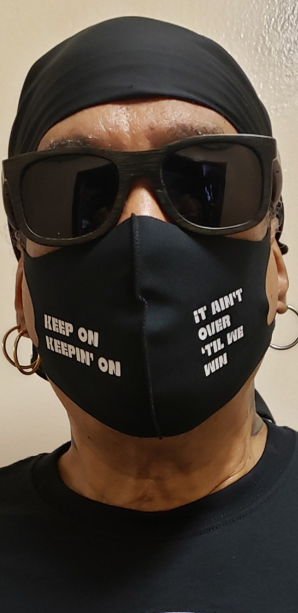 Face Mask That Reads "Keep On Keepin' On, It Ain't Over 'Til We Win"